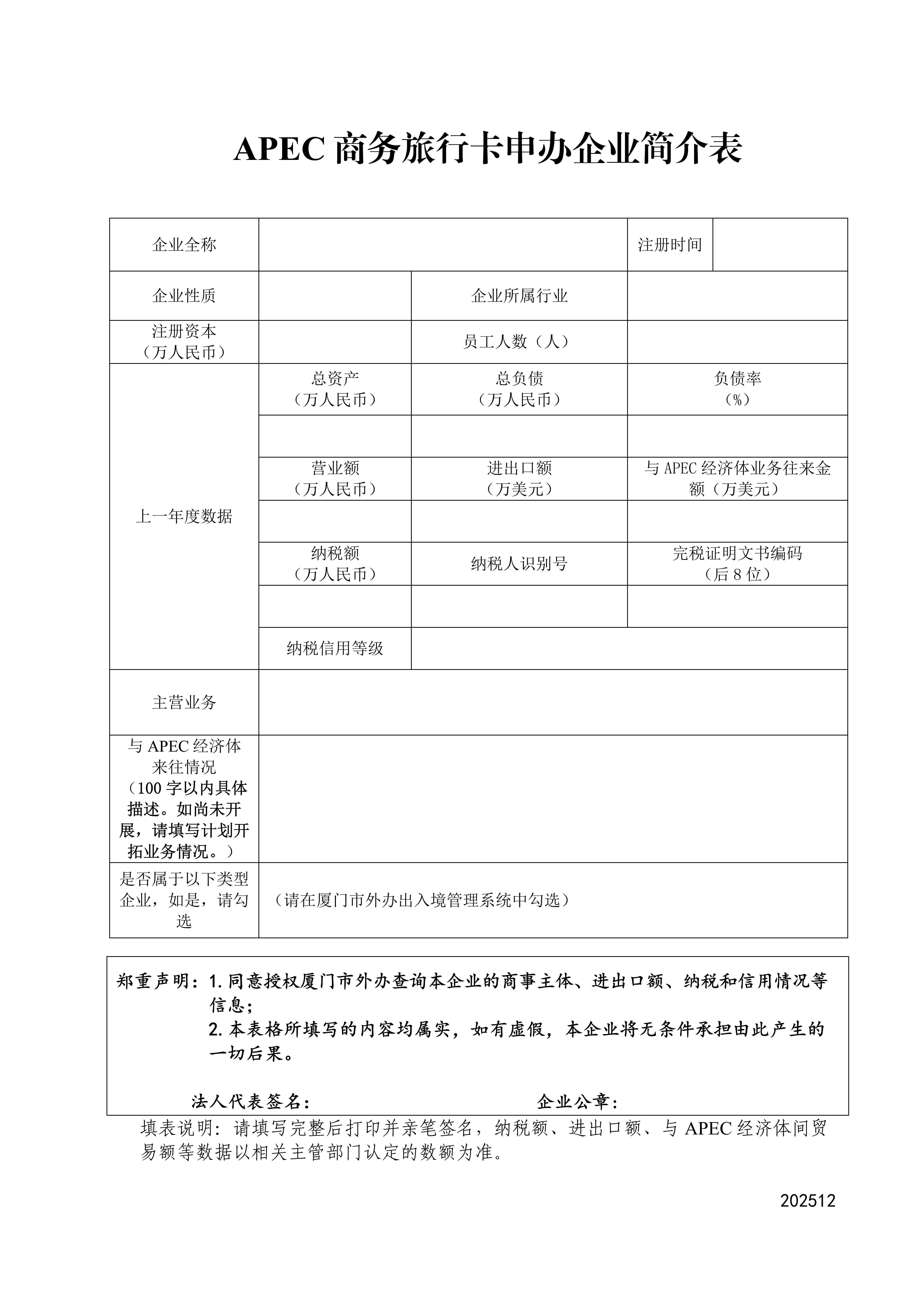 APEC商务旅行卡申办企业简介表